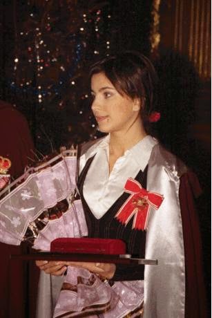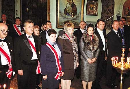 Її Високопревосходительство Перша Ледi України, Почесний Президент Нацiонального фонду захисту матерiв i дiтей "Україна - дiтям" Людмила Миколаївна Кучма приймає вiд Його Превосходительства Великого Прiора Ордену Св. Станiслава в Українi шевальє Павла Iвановича В'ялова Декрет про нагородження українською вiдзнакою Ордену Св. Станiслава I-го ступеня.
