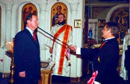 Його Високопревосходительство Великий Прiор України шевальє Павло В'ялов посвячує Його Високопревосходительство Юрiя Федоровича Кравченка, мiнiстра внутрiшнiх справ України, у лицарi Ордену Святого Станiслава.